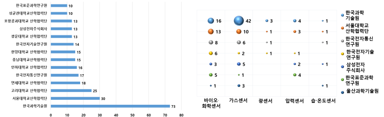 아래 그림 오른쪽은 주요출원인별 주요기술 동향을 나타내었다. 전반적으로 다양한 종류의 센서에 관하여 특허출원이 진행되었고, 그 중에서도 바이오.화학센서 및 가스센서의 특허출원이 활발하게 나타났다.