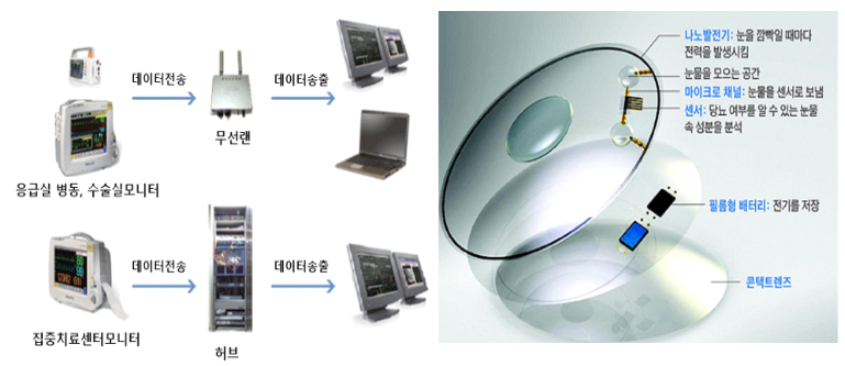 이미지 출처 : ( 좌 ) “ 스마트 헬스케어 기술 개요 ” 김정래 , ( 우 ) “ 당신의 당뇨 , 렌즈가 안다 ” 조선일보 , 신동흔