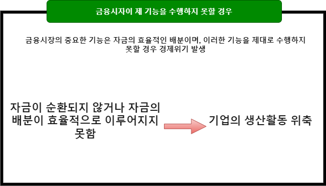 금융시장이 제 기능을 수행하지 못할 경우, 자금이 순환되지 않거나 자금의 배분이 효율적으로 이루어지지 못하여 기업의 생산활동이 위축된다. 우리나라가 1997년 말에 겪었던 외환 위기도 금융 부분에서 발생한 위기가 경제 전반에 막대한 영향을 끼쳐 일어난 것이었다.